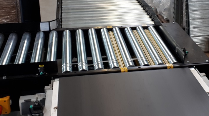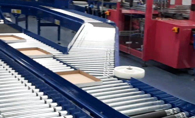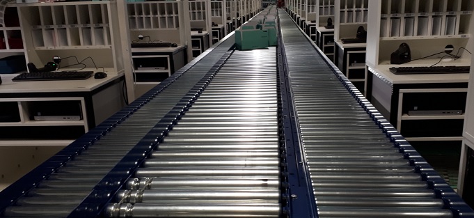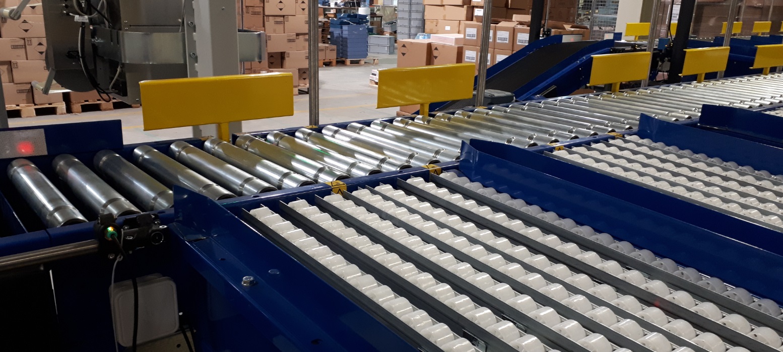 Een sorter bevindt zich op het einde van de transportflow en zal de lading op loodrechte banen uitsorteren vlak naast elkaar.