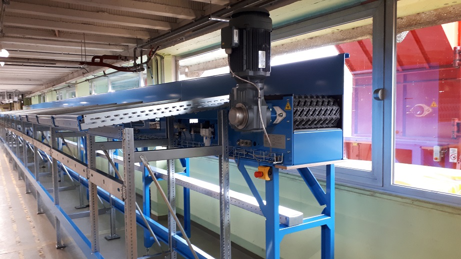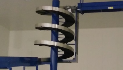 Een spiraalconveyor zal bakken op- of neerwaarts transporteren. Er wordt een bewaking voorzien op mechanisch falen ( bvb blokkering of bandbreuk)