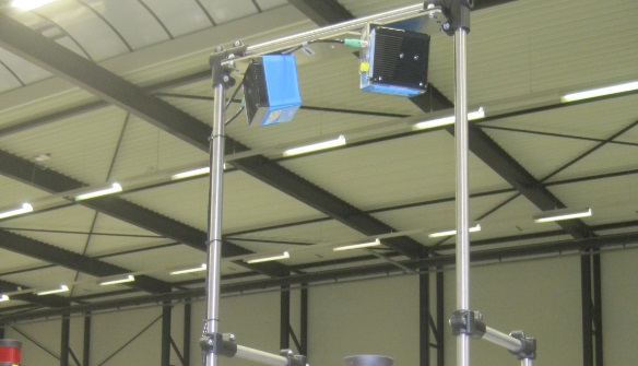 Een kruisscanner van het type SICK-CLV690 is geschikt om omnidirectioneel verzendlabels te lezen op pakketjes. De scanner typisch op ca 1,5 meter gepositioneerd boven de bovenzijde vd hoogste doos.
